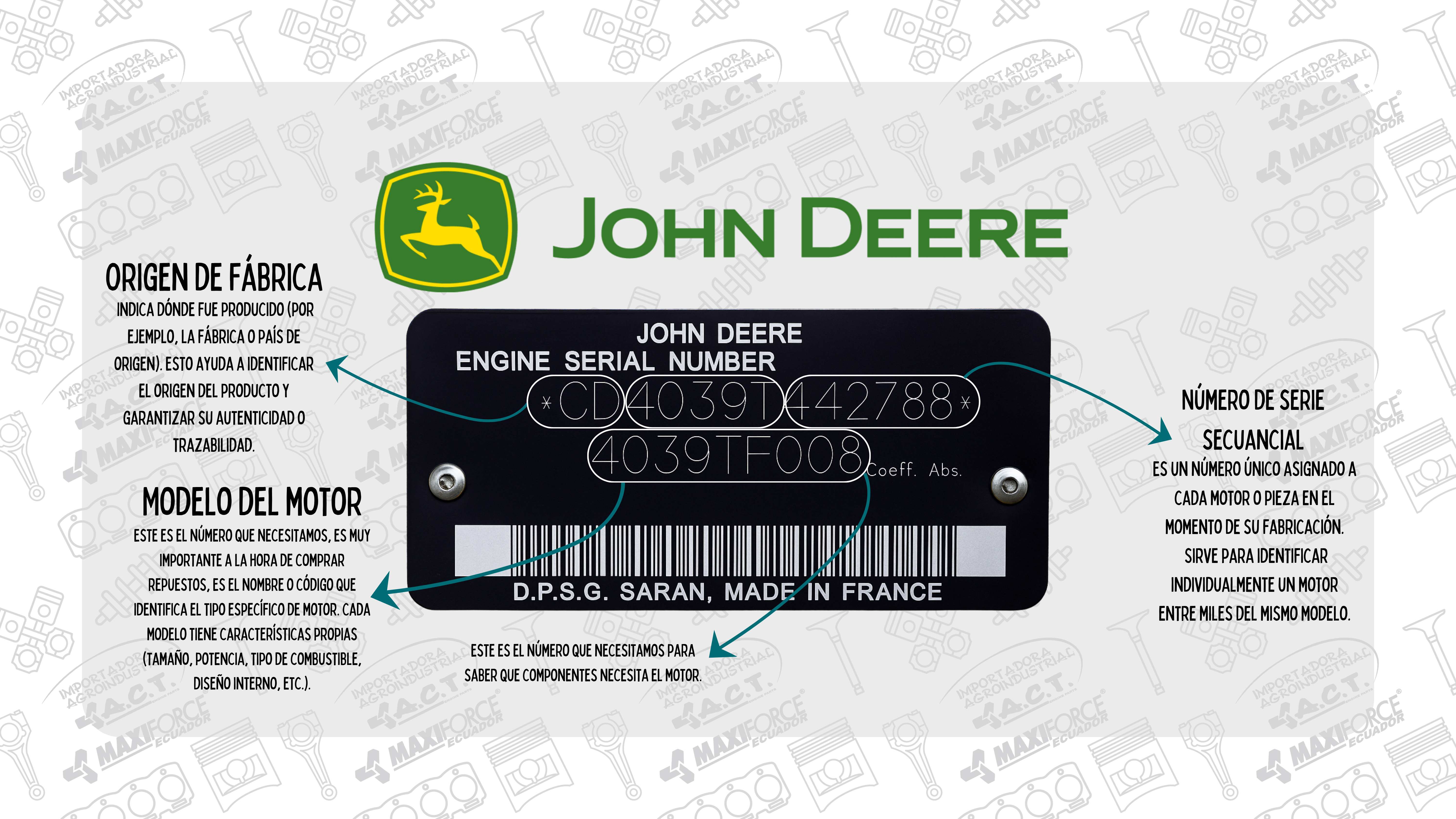 En motores John Deere, se utiliza un código PIN de 13 dígitos, ubicado cerca de la tapa de válvulas. Este identifica el modelo exacto, la fábrica y el número secuencial. Aunque se puede consultar el catálogo en línea o revisar el manual del equipo, el camino más directo y efectivo es enviarnos ese número: con esa información, en Agroindustrial ACT hacemos todo el trabajo por ti y te entregamos el repuesto correcto, sin margen de error.