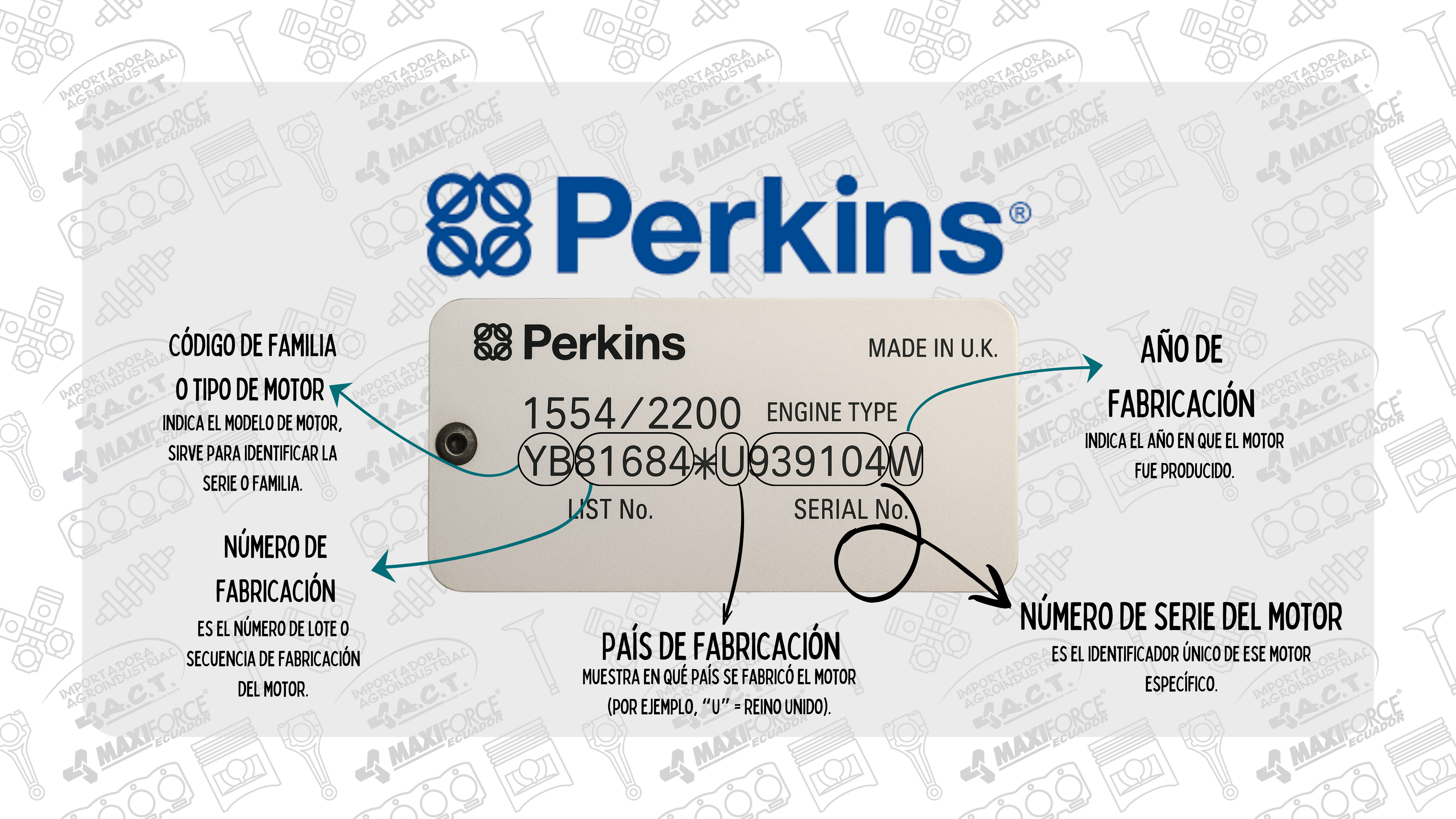 En motores Perkins, este número —también conocido como ESN— aparece en una placa metálica adherida al bloque. Decodificarlo permite conocer datos vitales como la familia del motor, cilindrada, país de fabricación y año de producción. Por ejemplo, un código como "RE12345U876543W" indica de forma precisa el origen y características del equipo. Sin este número, cualquier búsqueda sería tentativa y podría generar errores.